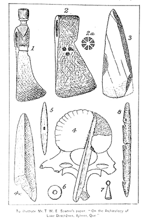 about a core of grass, which was doubtless worked into the shape- of the desired utensil. Then, by placing the whole mass in the fire the grass core would be burnt to ashes and a rude eathern vessel would remain as a triumph of aboriginal art. By the other method, some advance appears to have been made, as in this instance the matrix has evidently been manipulated both on the inside as well as the outside, which is evidence that the grassy core had been discarded by the adoption of a simpler process of manufacture. Specimens of celts or palaeolithic tomahawks, picked up at Bell's Bay and Raymond's Point, as well as others from neighboring localities, are very crude products of lithal workmanship. A fragment of stone appears to have been selected about the size and as near as possible the shape of the desired weapon. One end of this was then ground down to a cutting edge, and a celt from Raymond's Point has had one side reduced to proper shape by pecking. A peculiarity of many specimens from this district is, that the sharpened end of the blade has been ground flat on one side and broadly rounded on the other, something like the edge of a carpenter's axe. The arrowheads, from these beach workshops, vary in shape, as they were doubtless designed for different purposes. They are usually made of flint and some of them of white quartz. The Squaw's Knife, Fig. 1, and the arrowheads, Figs. 3, 4, 5, 6 and 7 in Plate II., were collected by Mr. Jacob Smith of the Interior Department at Ottawa. They are now in the collection of Rev. A.W. Mackenzie of Lakefield, Ont., who kindly loaned them to illustrate this paper. Mr. Jacob Smith, of the Interior Department, picked up a small and very perfect one, at Snake Island Point, which was probably designed for the killing of birds or small animals. It was only about one half the usual size and was made of light grey agate. A single arrowhead, made of bone, was taken from an Indian grave on the Lighthouse Island, and is probably the only specimen of the kind from this district. It should be remembered, however, that weapons made of this material and exposed for many years to the action of the weather, as well as in many cases to the attrition of the shifting gravel of the lake beach, would soon be destroyed ; so that the absence of page 228