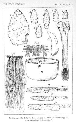 (originally published in 1900, The Ottawa Naturalist, Vol. XIII, No. 10: 225-238) By T. W. Edwin Sowter To those who are unacquainted with local topography it may be said that Lake Deschênes is an expansion of the Ottawa River, extending from the Chats Falls, in a south-easterly direction, as far as Deschênes Rapids, a distance of about thirty miles, and averaging from less than one to upwards of three miles in width. This beautiful expanse of water was known to the old "voyageurs" as "Lac Chaudière," and was so designated at a time as com-paratively recent as that in which the late John Egan was mayor of Aylmer, as there is an old by-law, bearing his signature, in the municipal archives, in which the westerly limit of the Aylmer Road is described as Chaudière Lake. A similar confusion of place-names, in this connection, is a source of annoyance to the student of natural or ethnic history in dealing with matters of local reference. For instance : Chats Island is now known to many as Moore’s Island ; Pointe à la Bataille has become Lapottie's Point, and Pointe aux Pins, the site of the Queen's Park, is known to summer visitors as One-tree Point. It seems a pity that names given to these places by the pioneers of civilization should be thus lightly set aside for the prosaic nomenclature of modern times. As already noted in THE NATURALIST, the evidences of Indian occupation of the shores of Lake Deschênes are of frequent occur-rence and of extreme interest to the archeologist. These consist, for the most part, of what may be termed beach workshops, or certain portions of the lake shore where the primitive workman page 225