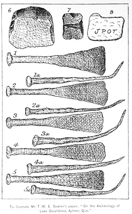 page 230 Some time ago while Mr. Charles Breckenridge was plowing on his farm at the mouth of Breckenridge's Creek, on the Quebec shore of the lake, about eight miles above Aylmer, he unearthed a large cache of gun-flints. He also found in the vicinity a couple of stone celts and the copper handle of a kettle. The handle was of rolled sheet copper and belonged to a large sized kettle. A very fine specimen of pipe-tomahawk was picked up by Mr. Samuel Edey on his farm on the N. 1/2 of lot 19, 2nd concession of the township of South Hull. The axe weighs 1 lb. 1 1/4ozs., and is one of the kind said to have been designed for presentation to Indian chiefs. The flint lock of a musket was also found at the same place, by Mr. Edey, but it was so badly rusted as to crumble to pieces on being touched. The point at which this find was made is about two miles from the lake shore to the north-east of Aylmer. Some years ago, while a path was being cut through a gravel bank in front of the summer residence of the late Col. J. S. Dennis, at Kingsmere, Que.., the workmen unearthed an iron tomahawk of French manufacture. An old squaw, who was living in the neighborhood at the time, informed Col. Dennis that according to a tradition of her people an Indian trail at one time led across the mountains, by way of Kingsmere, from the waters of the Gatineau River to those of Deschênes Lake. This is by no means an unlikely story, for on the earliest recorded map of the township of Hull, several creeks of consider-able size are shown as taking their rise at or near these mountains and flowing southward into the lake. Many of these tributary streams have shrunk in volume owing to the clearing away of the forest and subsequent drainage of the land for farming purposes and some of the smaller ones have disappeared altogether. Traces along these watercourses of the dams of the much prized beaver, as well as the testimony of the early settlers that this district was at one time teeming with game, are sufficient reasons for suppos-ing that these local tributaries of the Ottawa River were frequented by Indian hunters and trappers ; and as one of the largest of these streams flows from the mountains, within a short distance of Kingsmere, this may have been the direction taken by the trail above mentioned. page 230