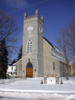 The modest stone construction is lovingly cared for by parishioners who maintain much pride for the integrity of their building and its interior. Among those elements which constitute a rich heritage for the parish and the town of Aylmer, is the painted scripture which runs around the top of the two long side walls of the main part of the church (example 1, example 2). This beautiful text was executed by T.W.E. Sowter at some unknown date, but likely sometime in the early 20th century. Additionally, a banner, executed in the same golden lettering adorns the rear wall, above the door of the main entrance, while golden fleurs-de-lys line the tops of the walls within the chancel.