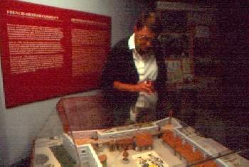 Lors de la visite archéologique de la ville de Kingston on s'arrêta aux bureaux de la Fondation Cataraqui où il y avait plusieurs expositions sur le patrimoine de la région. Ici, nous voyons Helen Armstrong qui examine une maquette du Fort Frontenac, emplacement militaire/commercial datant de la période du régime français. Ce site fut fouillé pendant les années 1980 par la Fondation Cataraqui.
