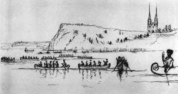 Canoes at Ottawa Drawing by H.W. Acland, 1860 National Archives of Canada, Ottawa C-096929 The then brand new Notre-Dame cathedral can be seen near the promontory (Nepean Point) where the National Gallery of Canada is now located.