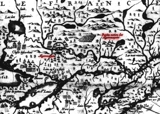 Above, the Ottawa Valley (not the specific references to Algommequins or Algonquins) as drawn by Champlain on his Carte de la nouuelle france, 1632. National Archives of Canada, Ottawa H2/900/1632 |