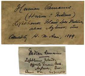 here are two artifact labels, currently in the collections of the Canadian Museum of Civilization, which document some human remains reported to have been found on Aylmer Island in 1899. One of these states specifically that the collection was gathered on June 24, 1899, the same day that the Ottawa Field Naturalists Club had its excursion in Aylmer and where T.W.E. Sowter was one of the leaders of the archaeological component of this visit, along with H.B. Small and J. Ballantyne.