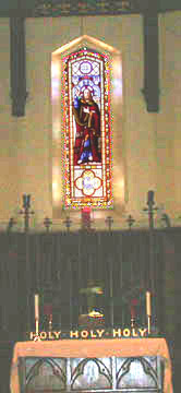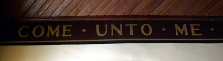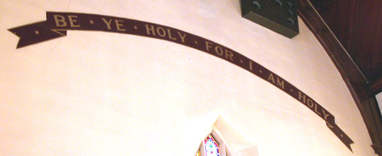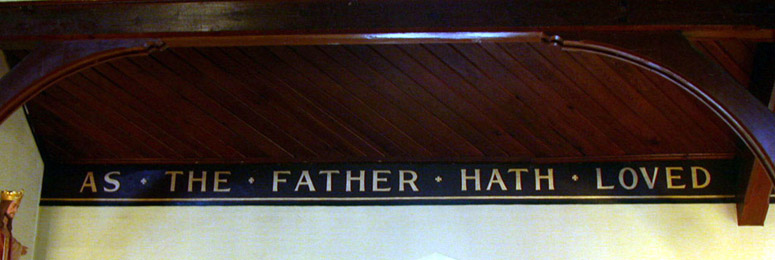 The modest stone construction is lovingly cared for by parishioners who maintain much pride for the integrity of their building and its interior. Among those elements which constitute a rich heritage for the parish and the town of Aylmer, is the painted scripture which runs around the top of the two long side walls of the main part of the church (example 1, example 2). This beautiful text was executed by T.W.E. Sowter at some unknown date, but likely sometime in the early 20th century. Additionally, a banner, executed in the same golden lettering adorns the rear wall, above the door of the main entrance, while golden fleurs-de-lys line the tops of the walls within the chancel.